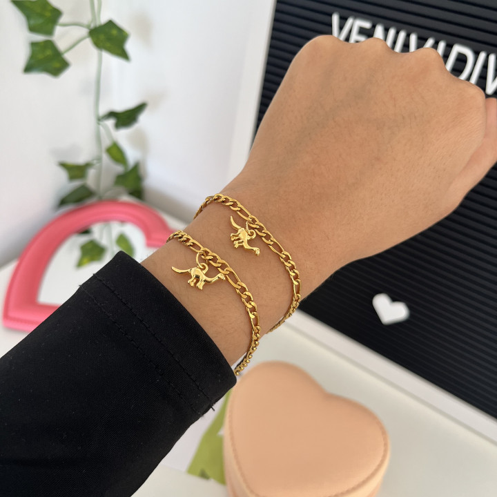 Dúo de brazaletes, acero inoxidable y dije en chapa de oro de 18k